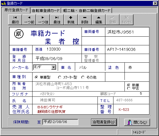 カード形式で原付登録を入力する画面です。詳しい説明は見たいところをマウスでクリックしてください。
