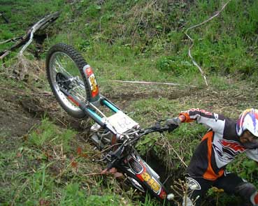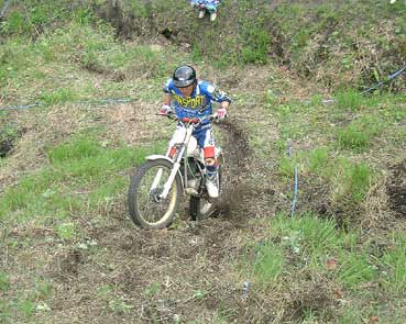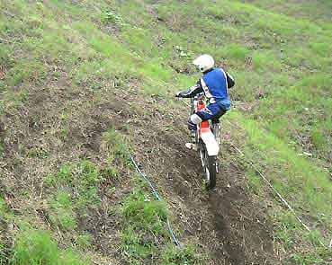 (^^;; 下りからの障害物はキライ》 しばらく直進すると左ターンから直ぐに右ターンとなる 《左の写真が右ターンからの..》 ここからがセクション1のポイントとなる登り、右ターンからの加速距離が短く、上れない人が結構いました。《私も1回失敗》 |