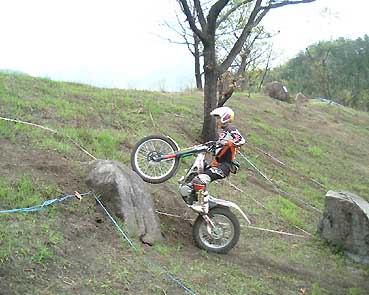 上りながら遠見に見える木を巻き込む左タ−ンをして下り、次に右ターンをしたらすぐにこの大岩?を越え、左ターンをしてアウト。ステアケース一発のコースレイアウト。