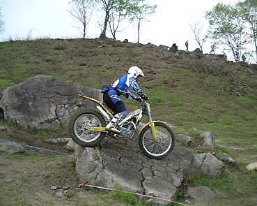 ☆コースレイアウトインで左写真の高さ40センチのステアケースを越えるセクションだが、このステアケースは登ると右斜めの下りのため思いっきりいけない心理作用があり、主催者の思惑通り足つき、バタバタありであった。ここを越えると左ターンをして、写真左奥の岩を巻いてアウトですがラインを外すとバタバタになる。 |