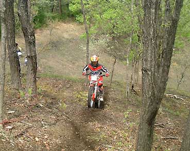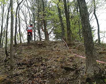 ☆コースレイアウト1 コースレイアウトはすごく広くとってあるのだが、バイクのパワーと乗りこなせる腕さえあれば、クリーンラインはただひたすら登る直線一本ラインです。ただ、途中でイノシシが掘った?(主催者が言っていた)と思われる穴にはまるとバタバタでは行けず5点となる。 |