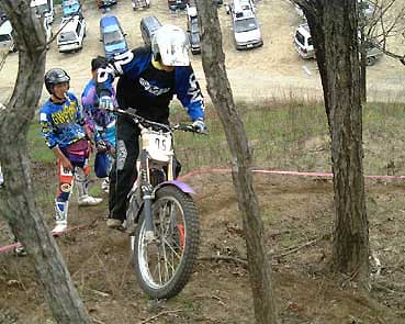 ☆コースレイアウト1 ここは一言で言うと斜面くねくねセクション。インでは下りながら入りコース一杯のラインを使い左キャンバーターンして登り始める。ここからのラインは二つあり、木の間を抜けるラインと木を回り込むラインある。 |